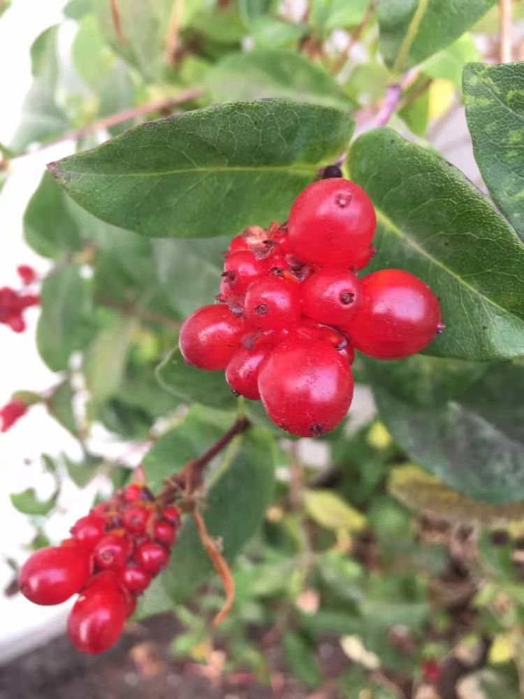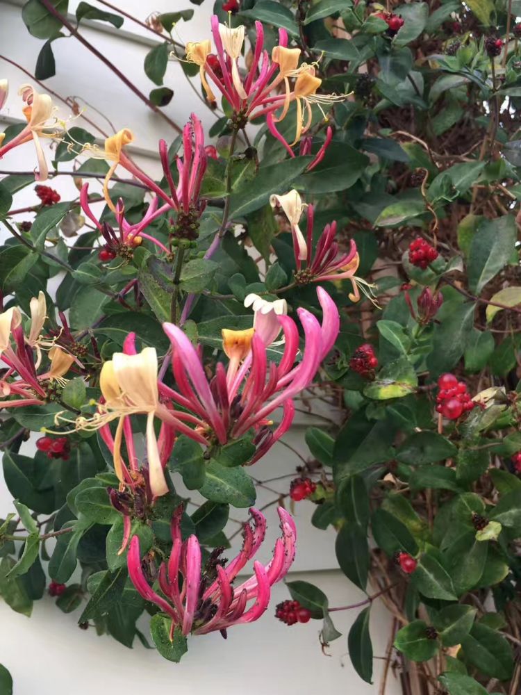 我从小常喝的金银花茶,用的是中国原生的忍冬花, 三月开花,微香,花初开则色白,经一、二日则色黄。还是花蕾阶段或者花朵初开时就要采下入药,一般等不及结果。观赏型的北美忍冬花能一直在生命的舞台上坚持到谢幕,算是一种幸运吧。