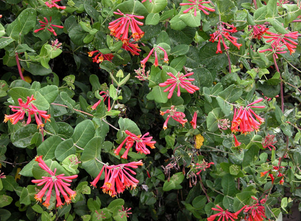 BC省不是重灾区,我并没有在家附近的原始森林里找到野生的忍冬花,倒是在公园边上的灌木林里发现了几株人工栽培的原产于美国东部的贯叶忍冬(Lonicera sempervirens)。它们的卵形(或者椭圆形)叶对生,凑成一个扁扁的绿色“盘子”,“盘子”中央长出一朵朵橘红色的长筒形花,花六朵一轮,数轮排成穗状花序。花叶奇特的生长方式总让我想起儿时看过的动画片《哪吒闹海》中的一个画面:太乙真人在大圆盘中央放上一颗莲子,莲子发芽,茎叶开始向上生长,很快发出一朵花来……