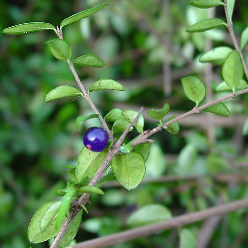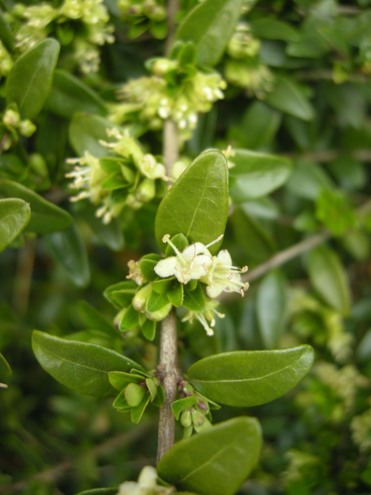 我还在一些生活小区里见到了一种叫匍枝光亮忍冬(Lonicera nitida)的多年生常绿灌木,俗名Boxleaf Honeysuckle, Wilson’s Honeysuckle。作为一种绿色的地被植物(ground cover),它在反复修剪下,通常只有一米高,外表和栒子很像,不在花期和果期时,很容易错认了。仔细观察,你会发现栒子的叶子是互生的,而它的叶子是对生的。