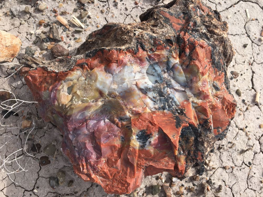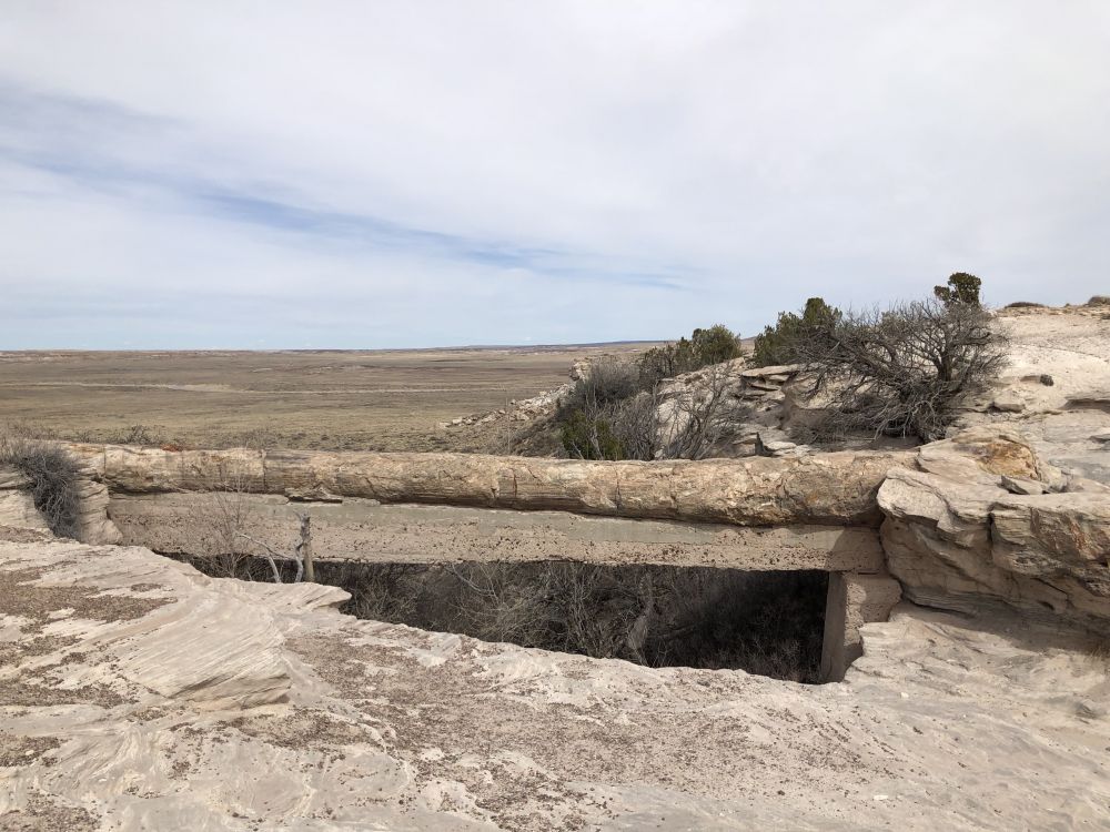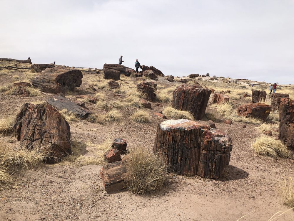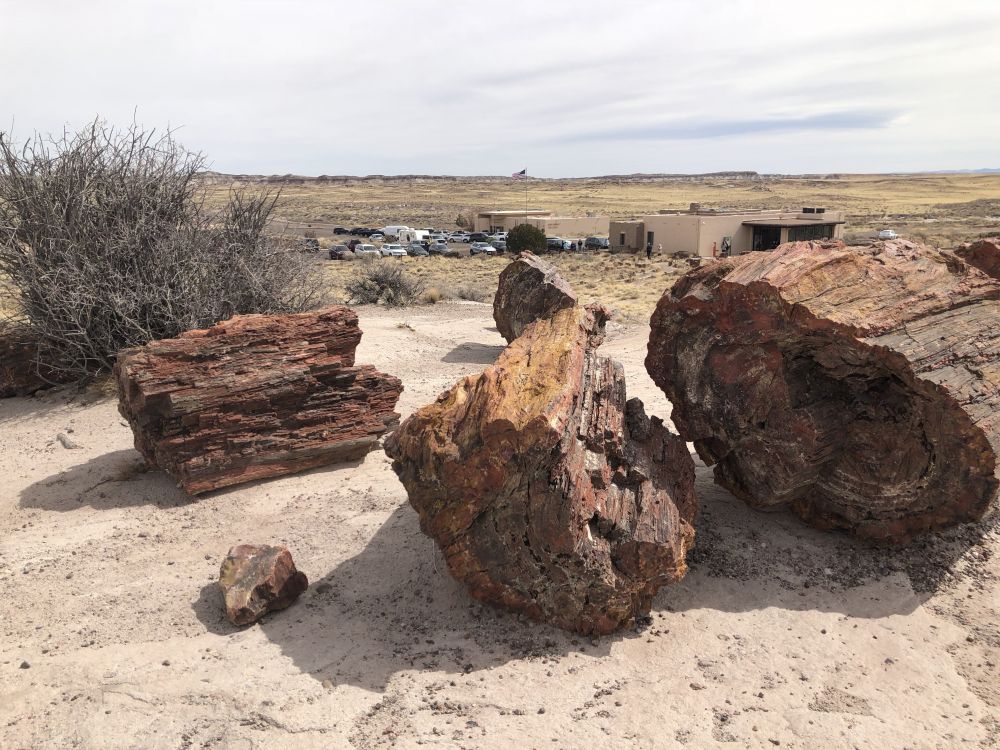 彩虹森林博物馆(rainbow forest museum)是最靠近南大门的第一个景点,也是游客中心。展厅里摆放着一些史前哺乳动物的骸骨,还有关于石化森林形成原因的介绍。展厅后面有一片低矮的小坡和沙地,一块块石化了的木头零零星星地躺在荒坡上。这些石头色调偏红,像落在地面的彩虹。一开始,我们以为有人用利锯将这些石化了的木头切成“寿司”状,随意摆放在地上的。看了介绍,才知道这些“寿司”造型是自然断裂形成的。