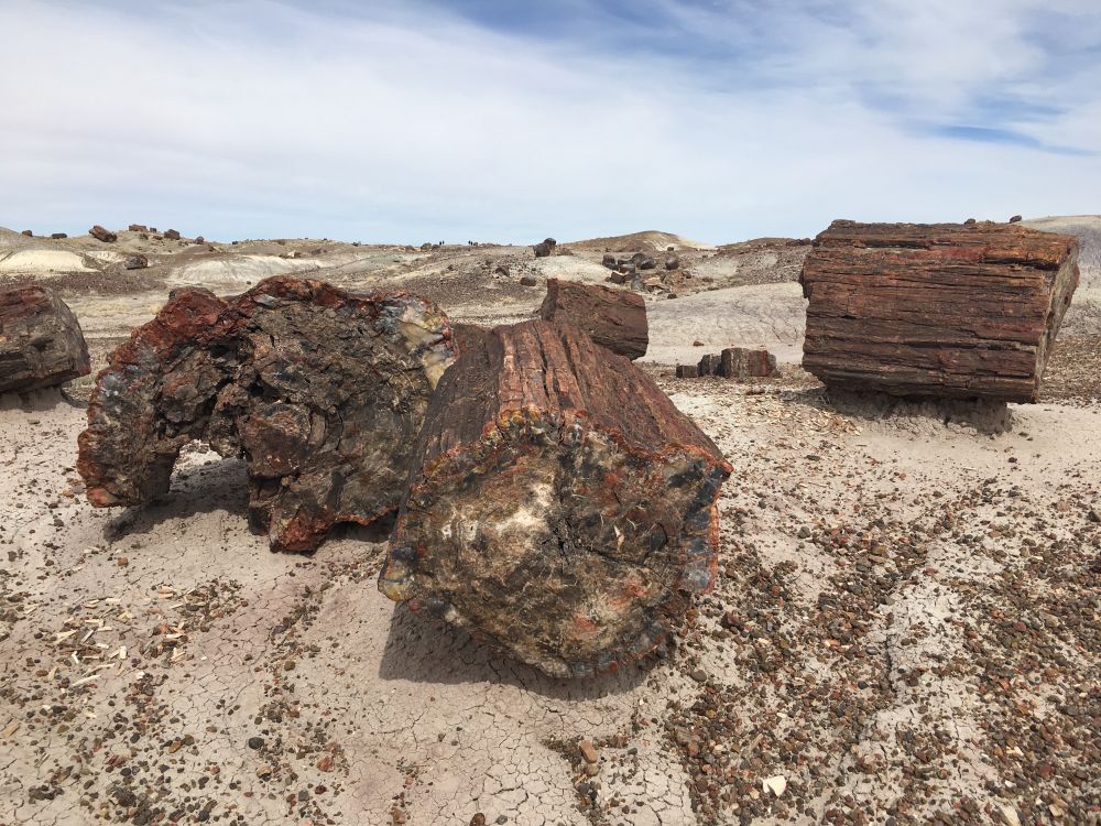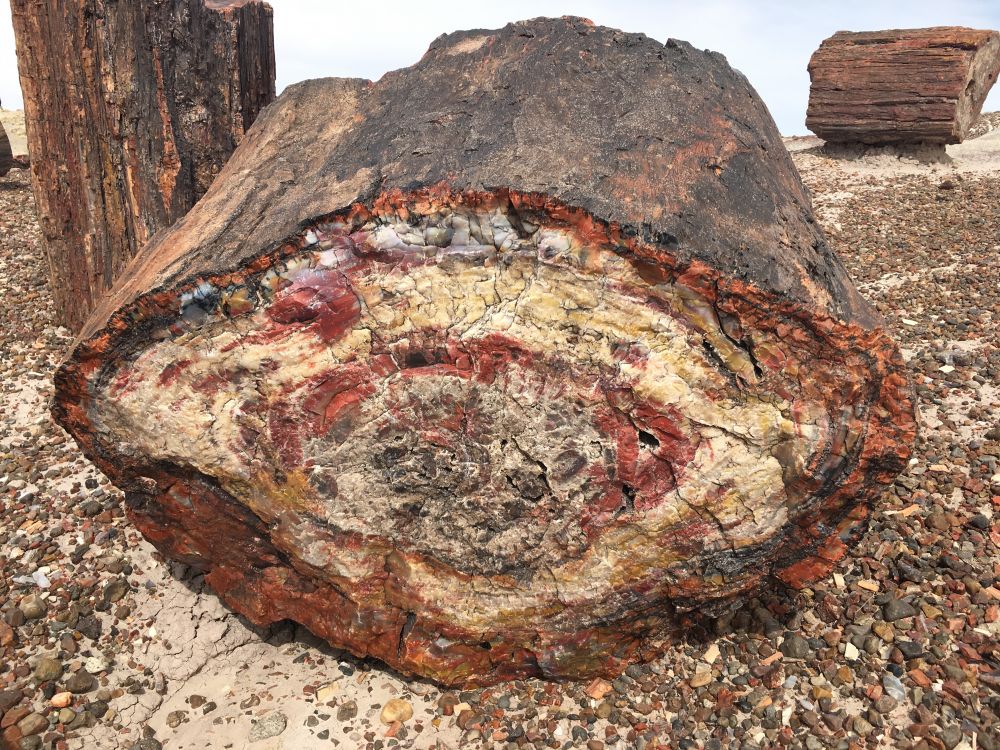 在美国亚利桑那州的东北部有一片神奇的土地,两亿多年前的三叠纪地质时代,这个区域洪水泛滥,倒下的树木横梗在河道上,渐渐被泥沙掩埋。富含二氧化硅的地下水过滤掉树干里的有机分子,产生了石英,这些木头开始了漫长的石化过程。其中含有氧化铁的产生红黄橙紫的色彩,含锰氧化物的产生黑灰两色,含纯石英的变成了白色。数百万年前化学作用停止,形成了一大片石化森林。