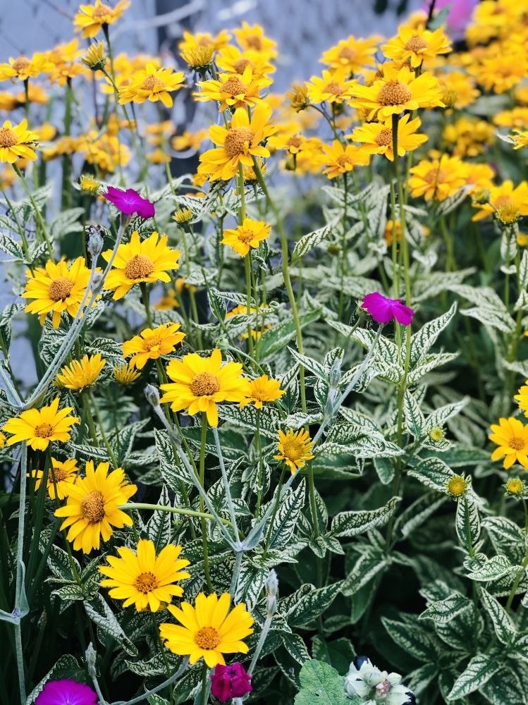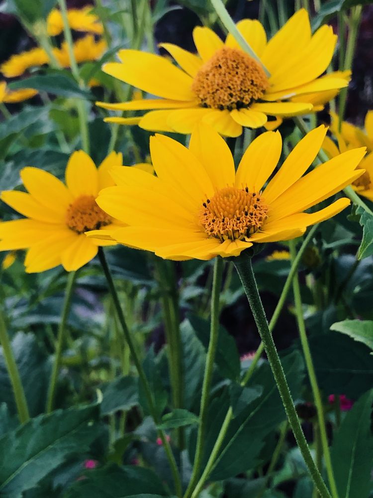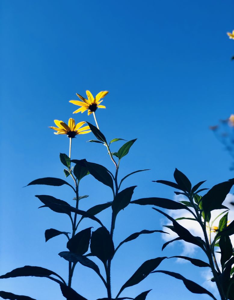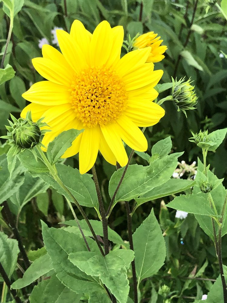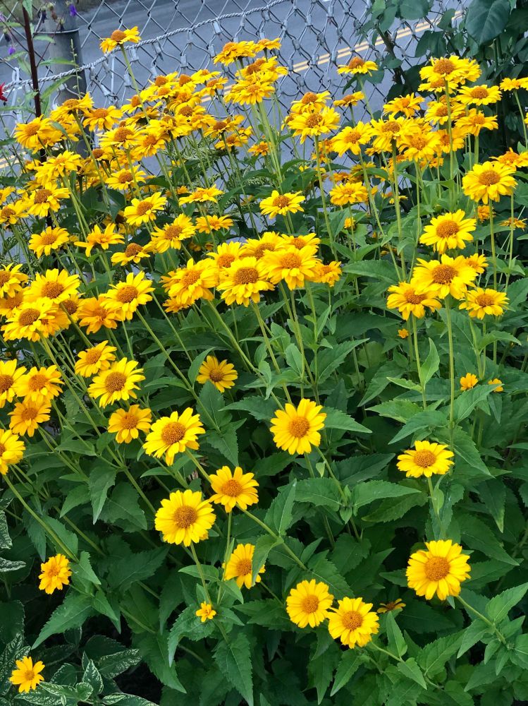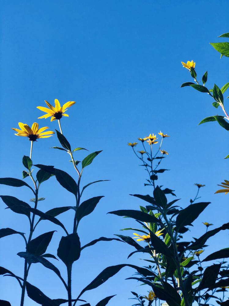 值得一提的是,北美虽有不少多年生的向日葵品种,因入侵性太强,多不被园艺师采用。所以苗圃里出售的向日葵花苗和种籽几乎是一年生的。如果你懒得年年繁殖幼苗,不妨考虑栽种由菊芋与美东的某种硬向日葵(stiff flower, 学名Helianthus pauciflorus var. subrhomboideus)杂交而成的柠檬皇后向日葵(Helianthus 'Lemon Queen')。这种多年生园艺品种不结籽又很皮实,茎干粗硬坚挺,丛生的特性使其特别适合做边界花。每朵花的直径约5厘米,花色是柠檬熟透时那种温柔的黄。