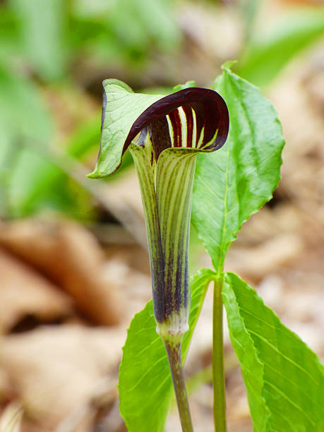 而我,却小心翼翼地掩饰着另类的花结构。我的植株数量很多,每年早春,但凡来到一片潮湿的阔叶林,边走边瞧,你会发现我成对的细长叶柄从密密麻麻遮掩地面的枯叶里钻出来,每个柄长约半米,顶端撑起一片三裂的绿叶。花朵就生在这两个叶柄之间,长三角形的“花”其实是佛焰苞,像一个帽兜。帽兜的表面是绿色的,稍稍不注意,你会以为那是另一片叶子,毕竟全绿色的花比较少见。只有弯下腰,将帽兜翻开 ,你才会发现里面鲜艳的深紫色的条纹。花朵内有一个手指形状的深色肉穗花序,像是一个躲在里面的小人。我的英文名字“Jack-in-the-Pulpit”(讲坛内的杰克)很好记, “杰克”即花中的那个肉乎乎的“小人”,“讲坛”即佛焰苞。拉丁学名Arisaema triphyllum,中国人称我为“三叶南天星”。