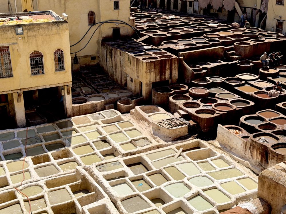 制皮作坊, 先用动物尿,鸟粪泡过去毛, 然后染色