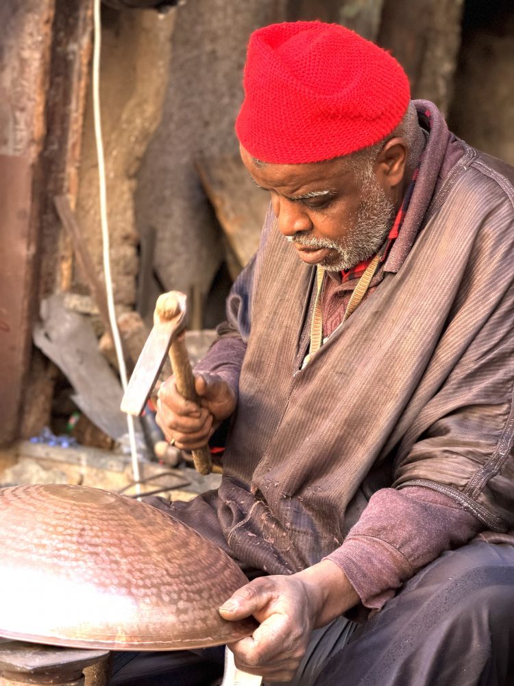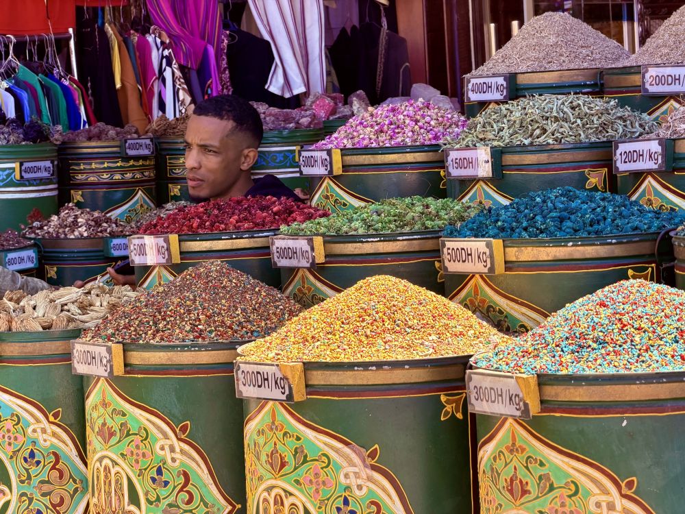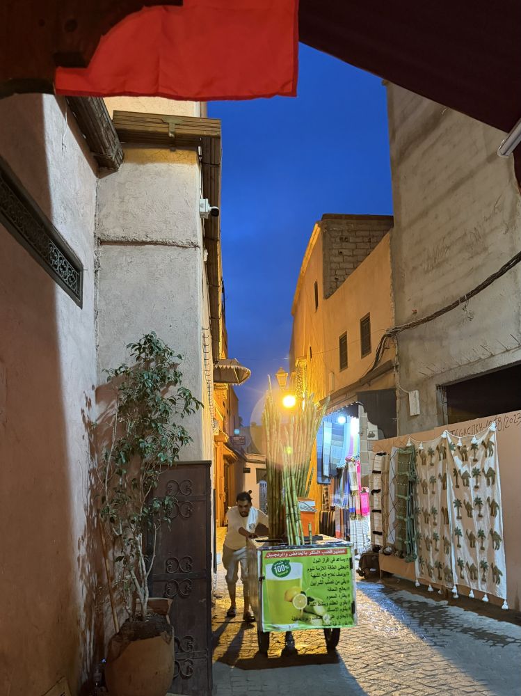 马拉喀什人最多,摩托车,板车人群中穿行自如。各式小摊贩热闹极了, 烈日下烟尘飞扬。满街的游客兴致勃勃。 换钱处每隔一条街就有, 总是挤着排队换钱的游客。 因大部份商家不接受信用卡和外币,最好随换随用。 喜欢或者怀念手工制品的过瘾了。 那一家连一家的各式铺子琳琅满目, 看不过来。店主与游客互相打量,互为风景。 老城里数不清的巷子按产品分类, 同类产品一起。 小店兼作坊, 可以当场刻字, 修改, 立等可取。 没有标价的东西可以砍价, 砍过价再遇到还记得,会像朋友一样打招呼。