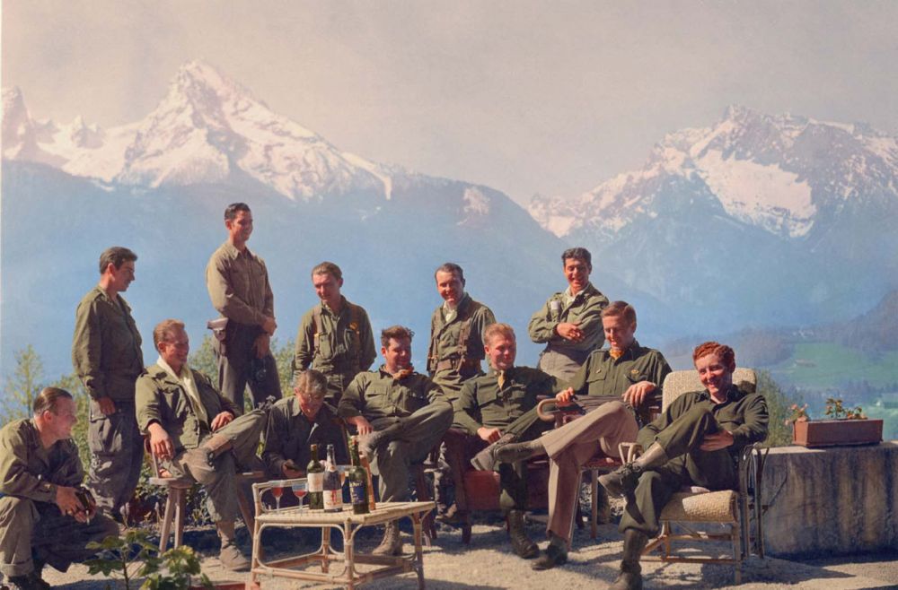 1945年,美国陆军第101空降师士兵在希特勒的“鹰巢”合影,茶几上摆着缴获的好酒。照片经过彩色处理。