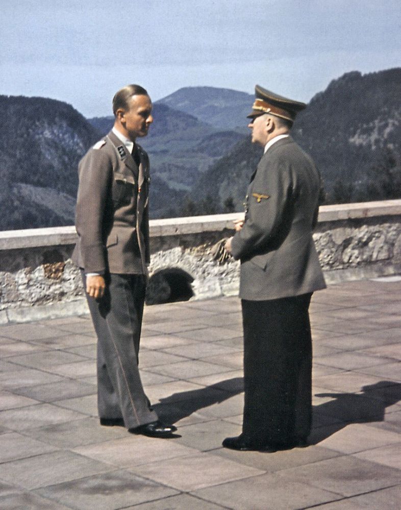 希特勒和爱娃及其德国狼犬在奥地利境内的伯格霍夫住处。苏联红军攻占伯林的最后时刻(1945年4月30日),二人在柏林的元首地堡中身亡(希特勒开枪自杀,他妻子爱娃·布劳恩服毒自尽),为避免被人倒挂尸体示众,重蹈墨索里尼的覆轍,按照希特勒的指示,他们的尸体被焚烧,标志着第二次世界大战在欧洲的结束。