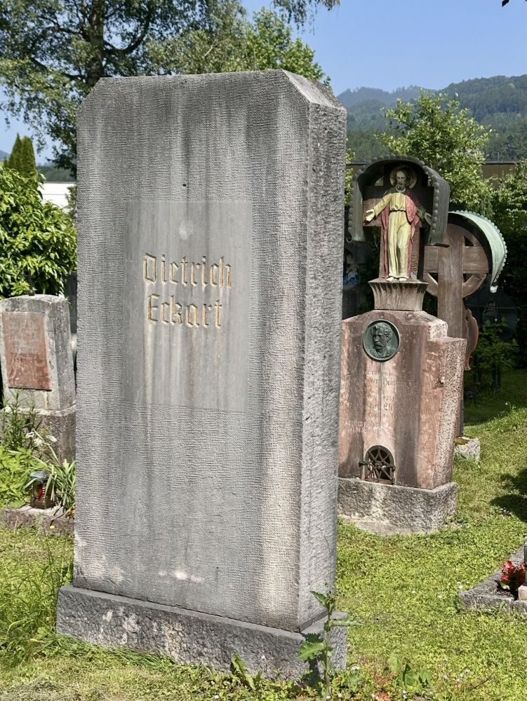 先到镇边上的一个墓地,希特勒早年的忘年交和精神导师葬在这里,他在1923政变后入狱,出来后于当年死亡。希特勒成为"元首"后称其是"早期国家社会主义运动的指路明灯"(国家社会主义简称纳粹)。导游说这座墓今天仍有人为之缴年费,按当地法律不能被清除。镇上只允许碑上刻名但不能书写任何其他文字,包括生卒年月。