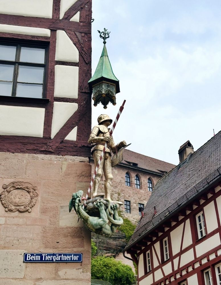 背景中的尖塔是纽伦堡圣塞巴尔德教堂。二战期间受损,战后修复。