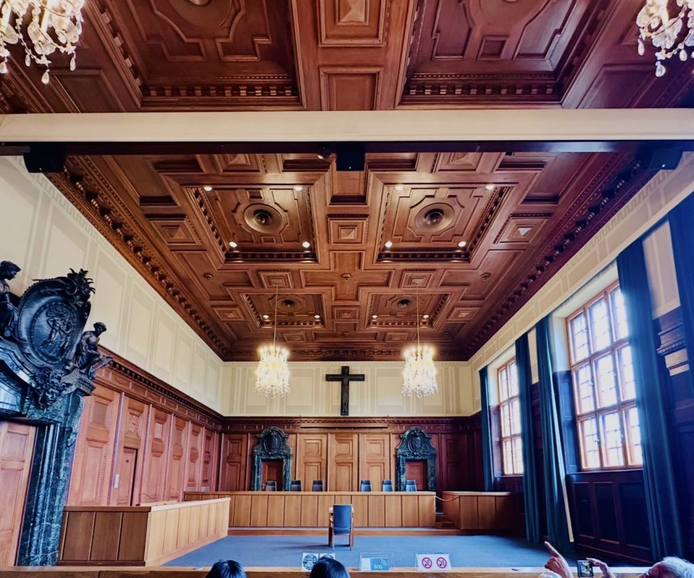 参观当年的审判大厅(战前的纽伦堡法厅),大厅上方有银幕放下,为访客播放当年审判的记录片,很值得一看,尤其是身临其境。