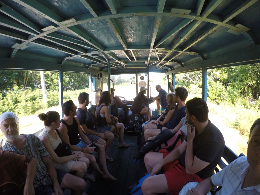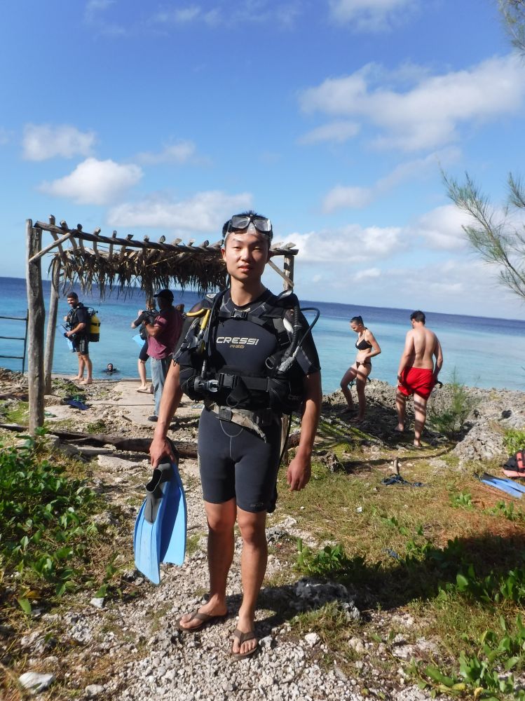 第二天早晨,8点半出发去潜水,Bus 到住处来接我们。我们订了7点吃早餐,早餐照例是鲜果汁、面包、水果等,很丰盛。吃完后,我们穿上游泳衣,拿好大毛巾,准备好水下相机和我们自带的mask和snorkel 。之所以用我自己的mask,是因为我眼睛不好,近视,专门买了带近视的mask。带自己的snorkel,是要在潜水之后,再玩一会儿浮潜。不一会儿,Bus来了,上车走人。开车十几分钟就到了潜水店,在这里登记、交钱、拿潜水衣和气瓶。再上车,又开了一会儿,很快就到了潜水入水点。