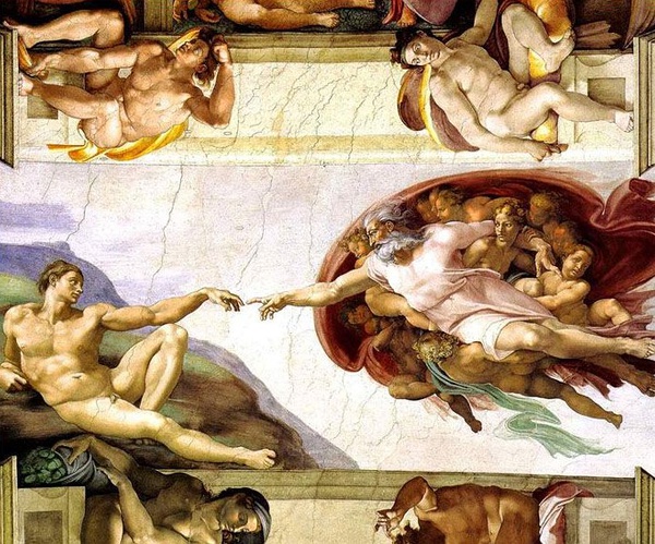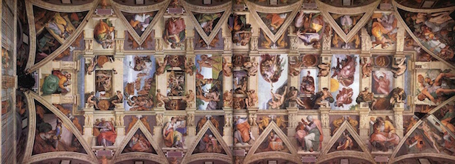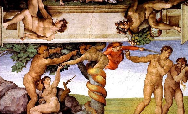 我强迫自己抬着头,听这语音解说眼睛随着《创世记》移动,这幅作品 分割成九个画面:分别描绘《神分光暗》 《创造日月与动植物》 《创造大地和水》 《创造亚当》 《创造夏娃》 《原罪·逐出乐园》 《挪亚祭献》 《洪水》 《挪亚醉酒》 九个主题。以建筑结构等柱壁装饰,把每个画面分隔开。并在每一分隔的区域内四角,画上共二十个裸体青年,再在各区域的四个大框内画了十二个形体较大的先知与巫女的形象。看着这些故事如同聆听一曲颂扬人类创造性智慧,赞美人性与人的肉体的美的宏伟的交响曲。 每一个乐章,每一个画面以及每一个壮美的裸体都蕴含着对人生欢乐与创造力的肯定。