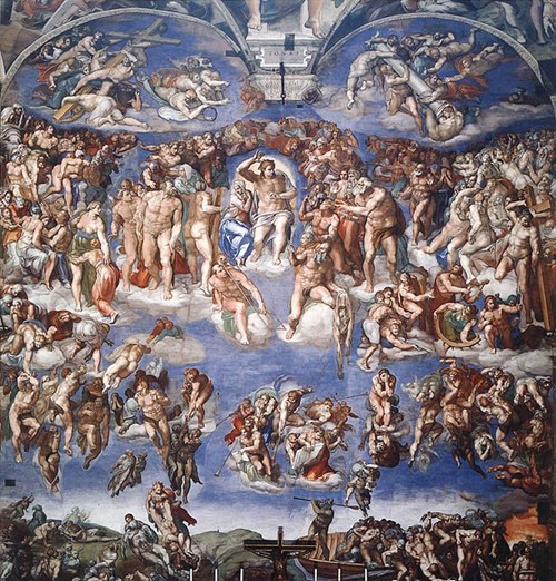 这是西斯廷教堂西墙壁画“末日审判“全景,它是米开朗琪罗于1535-41年完成的最有影响的壁画之一,390多个人物,壁画分为四层。