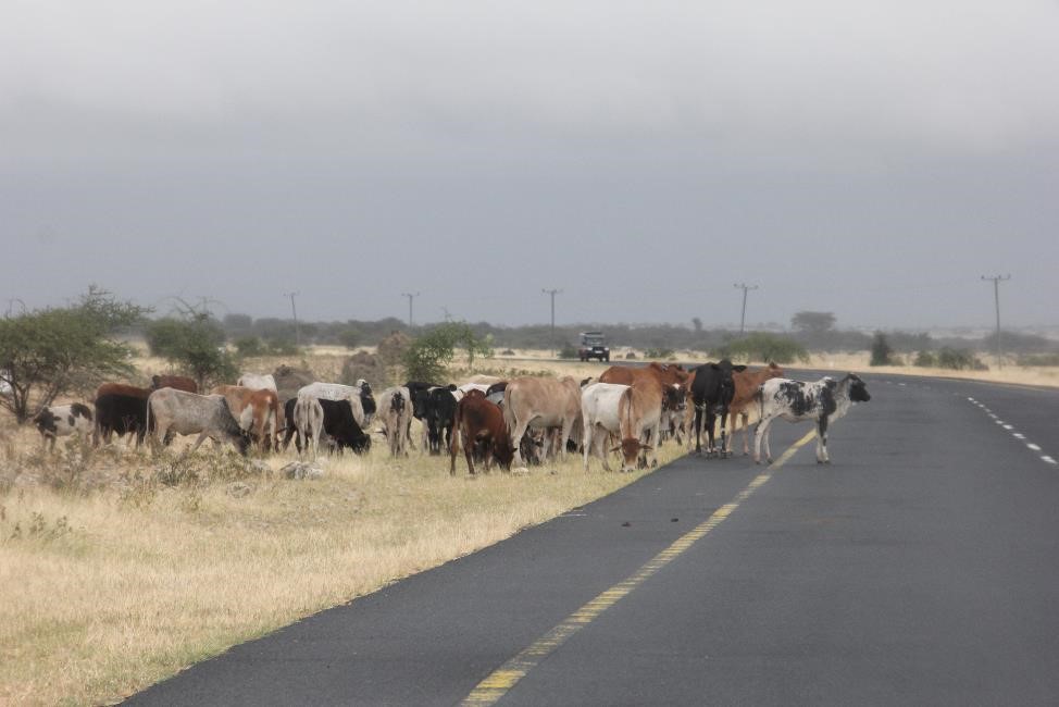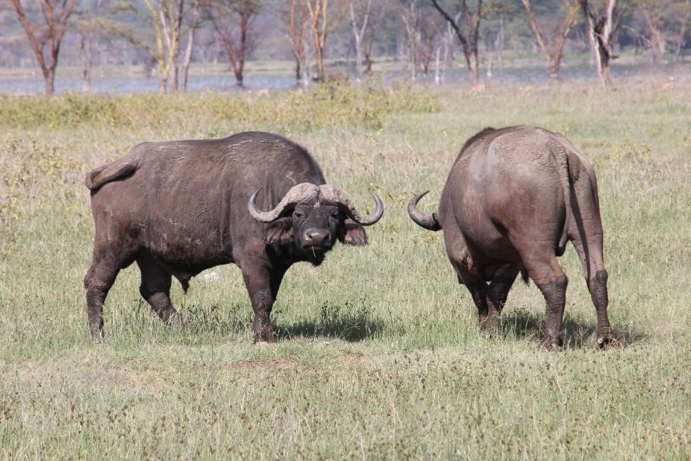 非洲水牛是我们进入 Lake Manyara 国家公园后遇见的第一批动物群体。 我们乘坐的吉普车沿着蜿蜒的小路缓行时,突然看到前面有大片的黑乎乎的非洲水牛。 只见这些水牛密密的站在一起,警惕的看着我们。 在我们双方互相注视一阵之后,有一些水牛又开始吃草。 在这些水牛之中, 还有一些比较小的,显然是未成年的。 小水牛大多对母亲寸步不离。 我们的司机兼导游Rama 把车停稳后告诉我们, 这些水牛基本上都是雌性的,因为她们的角是呈现圆弧型。 Rama 还告诉我们, 水牛们多数是雌性的与未成年的水牛们在一起群体活动, 在她们的群体中,雌性水牛是起着支配作用的。