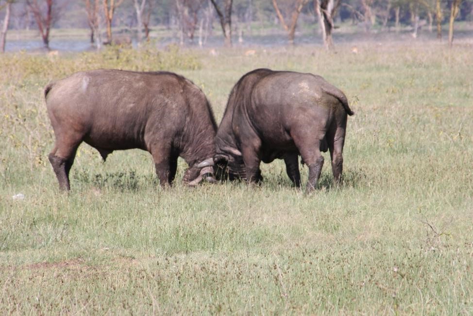 我们很难看到成年的雄性水牛的影子。这是因为,野生的非洲水牛基本上是母系社会体系, 雄性水牛在完成交配的任务后会被雌性水牛和未成年的雄性水牛强力逐出群体。 换句话说,雄性成年水牛是不被允与其他雌性水牛群体以及未成年水牛一起生活的。 果然,在离这一群雌性水牛约一公里处,我们看见了一头成年的雄性水牛,孤单的独自吃草。 Rama 告诉我们,这一头雄性水牛基本上是在等待死亡,因为他已经无用了,雌性的水牛群体不要他。他要靠自己去生存,去发现潜在的敌人和危险。当有狮子临近时,没有别的水牛来给牠报警,或吸引狮子的注意力,牠将是狮子的唯一攻击目标,牠的处境很危险。