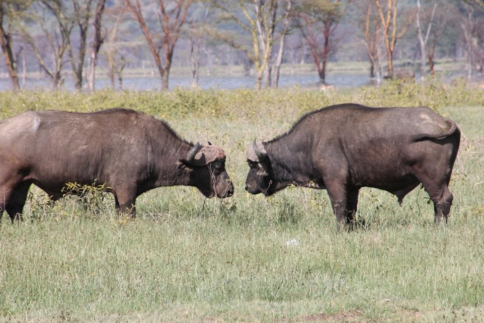 非洲水牛与亚洲水牛没有任何关系。中国人通常对牛有着好感,我们在形容一个人任劳任怨时,常用老黄牛这个词。中国还有“俯首甘为孺子牛”的著名诗句。 可是,在非洲,你千万不能认为非洲水牛是温顺的。非洲水牛性情不可预测,攻击力很强。非洲水牛的体重可以达到1吨之重。当牠们发怒时,就是狮子也要退避三舍。 目前尚无非洲水牛被驯服的记录。 当他们自卫时,他们会密集的聚在一起,使狮子们无处下手。水牛一旦从群体中被孤立出来就很危险了。 此外,当有水牛发出呼救时,其他水牛会前来救助。当发出的救助呼叫是幼小的水牛时(Stress Calls),几乎可以肯定会得到其他水牛的救助,特别是母亲的救助的,而且救助的成功率很高。我们在营地吃饭时曾经看过非洲水牛与狮子抗争的录像镜头,我们既看到过狮子吃掉水牛的镜头,也看到过非洲水牛奋起反抗而杀死狮子的镜头。