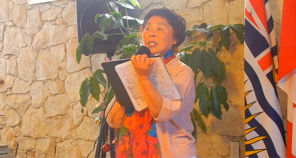 女高音戴晚秋老师来晚了,但是大家不放过她,在掌声中她演唱了“大海啊,故乡”等两首歌。