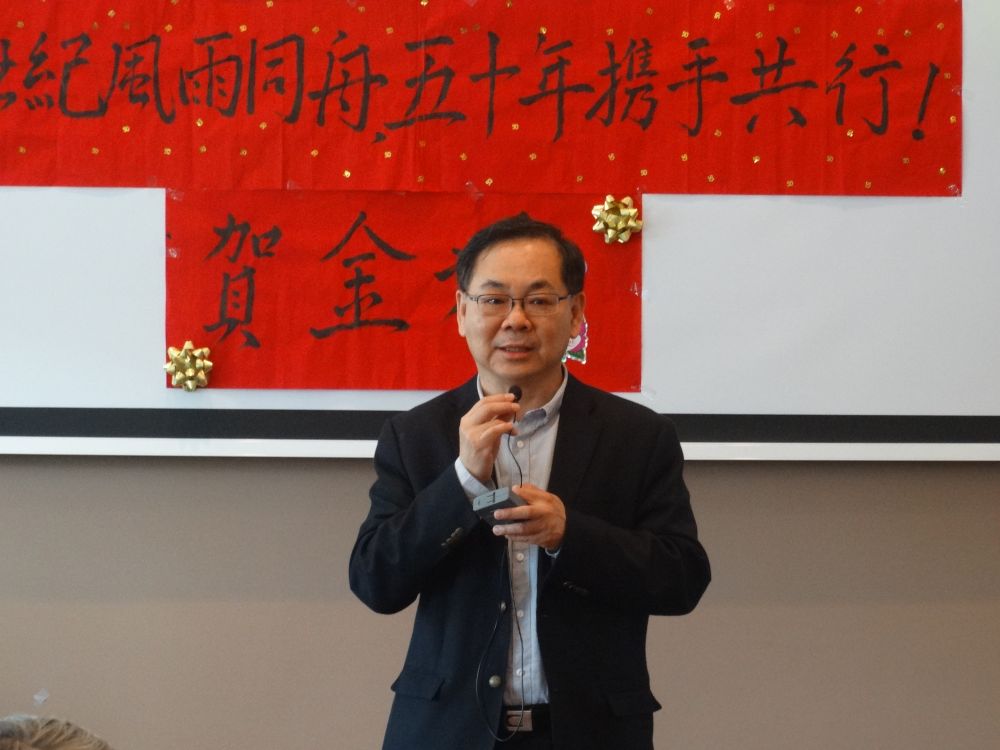 牛华执行会长致词,祝贺金婚佳偶,赞扬了华裔移民老年朋友重视家庭,传承中华文化,信守誓言的正面形象,牛华会长代表华联总会赠送健康营养品。