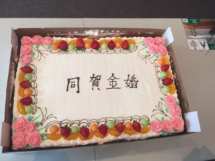 分会准备了一个18寸大蛋糕,同贺金婚,全体与会者共同分享。