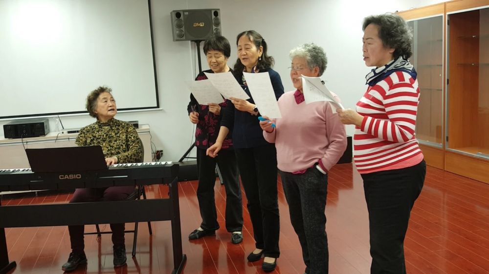 接着戴晚秋老师教唱新歌曲《不忘初心》。请看教唱的片段: