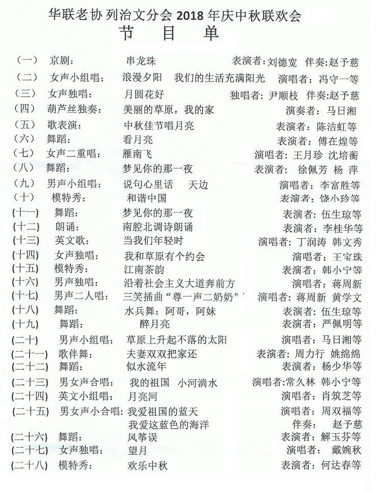 然后,演出开始。从分会义工杨少华老师和陆笑梅老师制定的节目单上看,这次联欢大家准备了近三十个文艺节目,很多都是近期排练出来的。大家尽情欣赏精彩的表演。