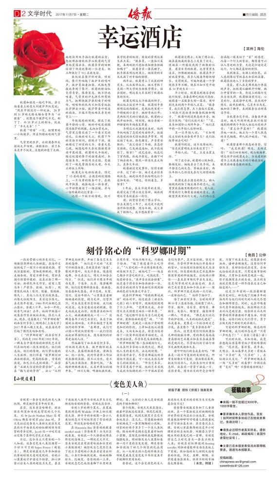 中篇小说《人家的姑娘有花戴》作为首页推荐作品今日上架上海作协《华语文学》。小说中国首发于2017年7月上海《新民晚报》,北美首发于2017年10月美国《侨报》。