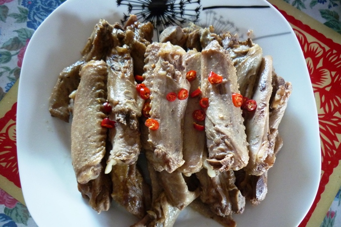 放入鸭膀后煮沸,烧20分钟,熄火。30 分钟后盛出装盆,撒上些切细的红辣椒。
