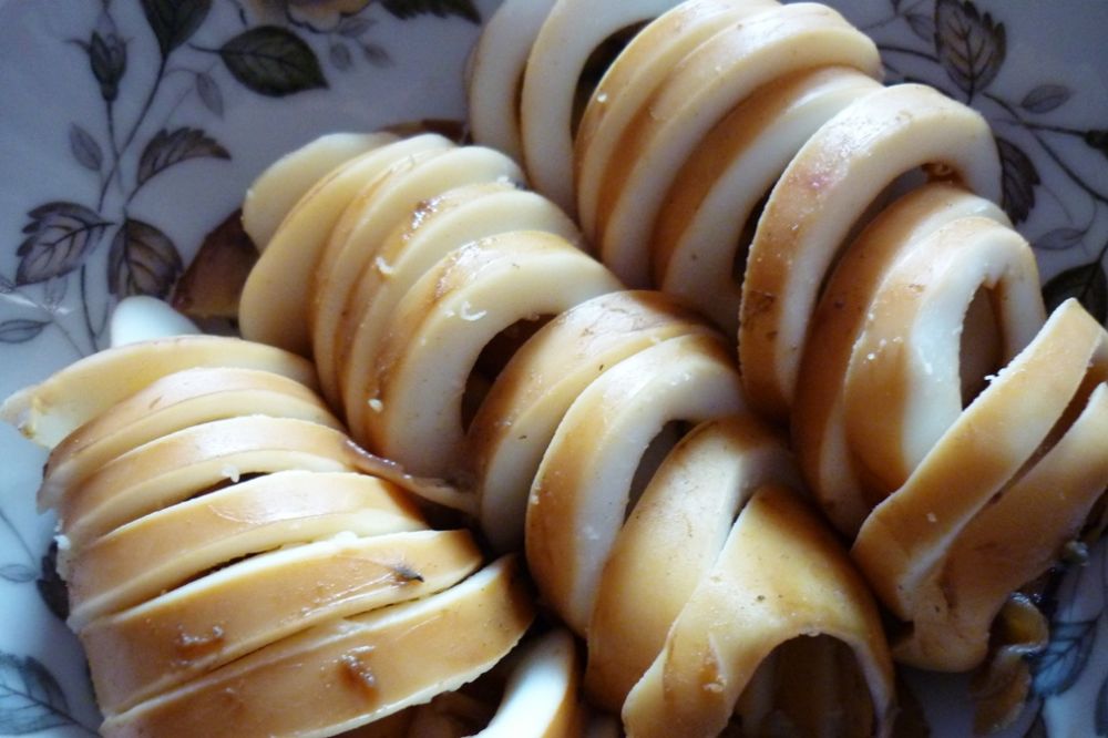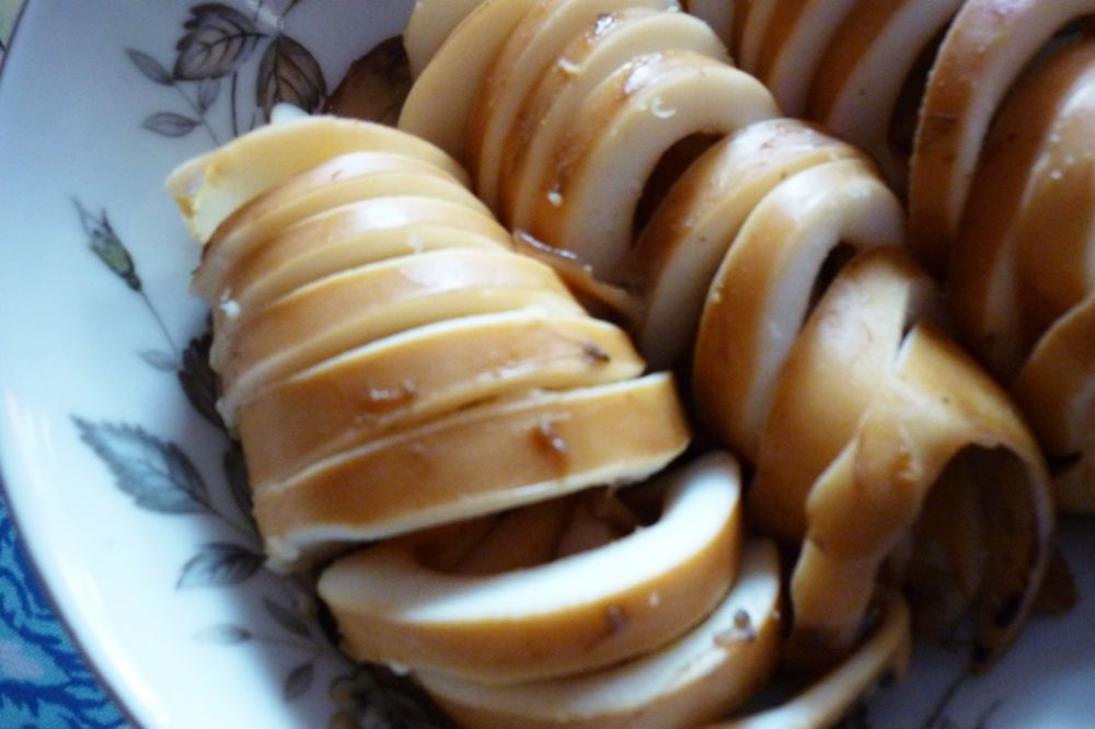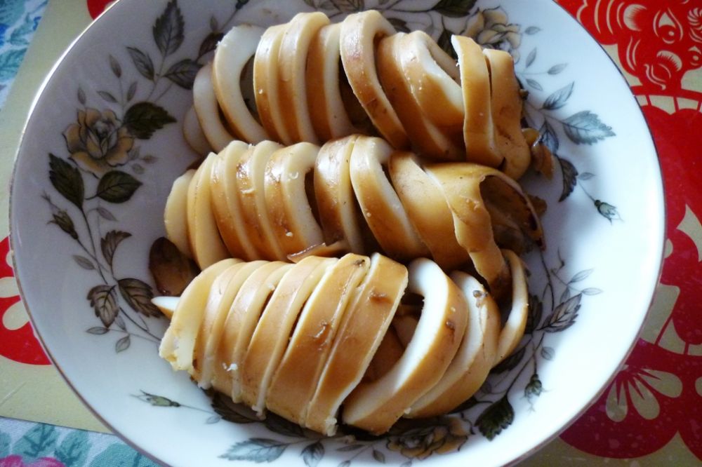 墨鱼大拷是一道上得了台面的家常菜, 做法也是相当简单。1,取猪腱子肉洗净,切块。2,象做红烧肉一样煮半小时。3,放入洗净的墨鱼,煮半小时。4,放锅里焖半小时。5,墨鱼切块,弃肉不用。用五花肉更好,但不健康,所以我选用腱子肉。 这在风味上是有点欠缺的。鱼的鲜味和肉的肥腴,相得益彰。 是下酒绝佳的好菜。