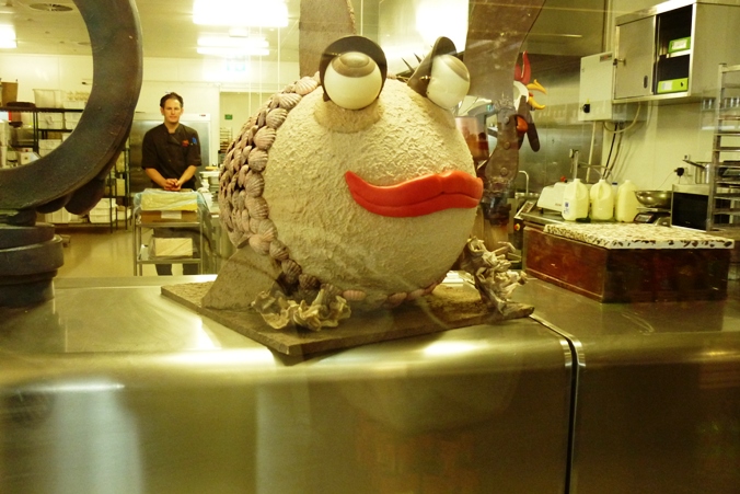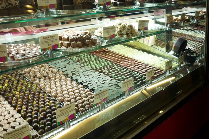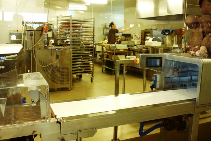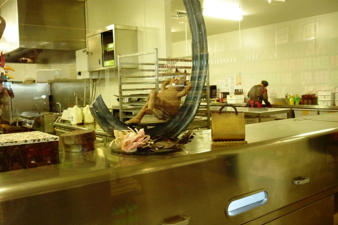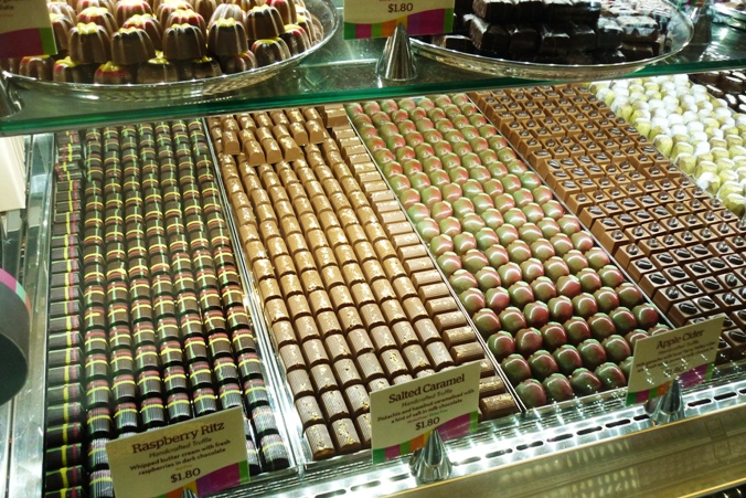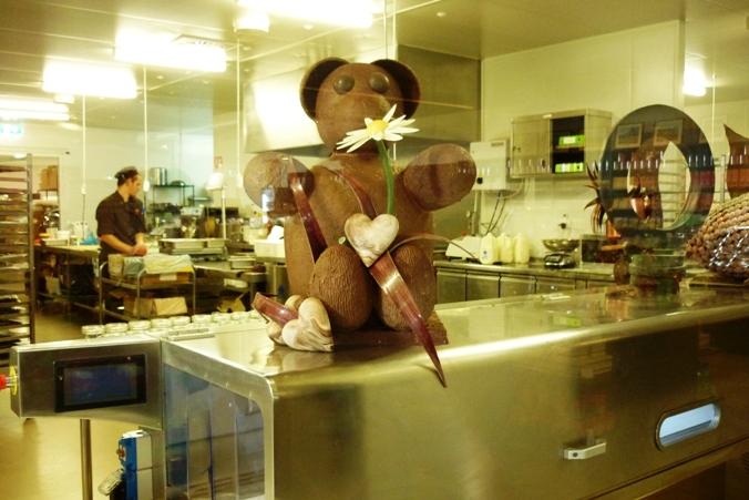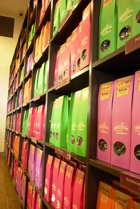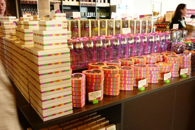 拿上把免费巧克力嘴甜上心就定了, 慢慢欣赏巧克力工厂。整个建筑大概一半的面积是工厂一半的面积是商店, 还能看到几个工人在做巧克力。 透过玻璃还能看到陈列着一些作品。而商店里的巧克力真是堆积如山,销售也是好得出奇。