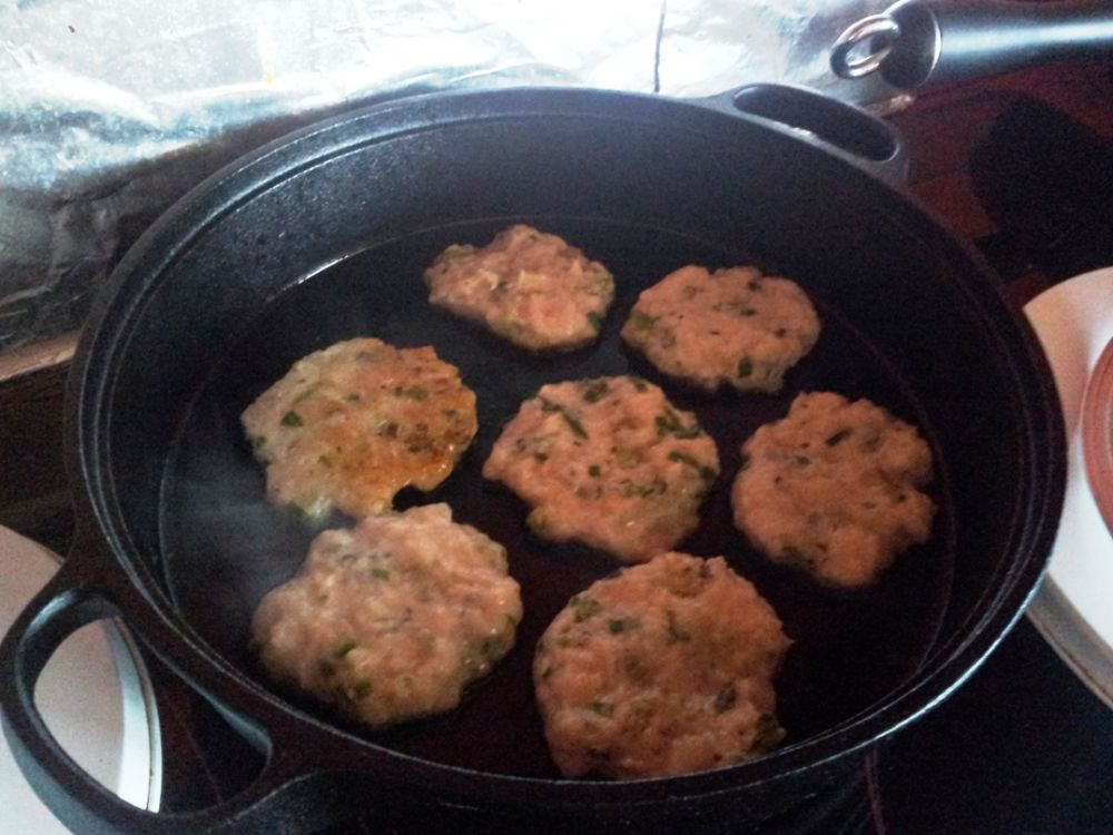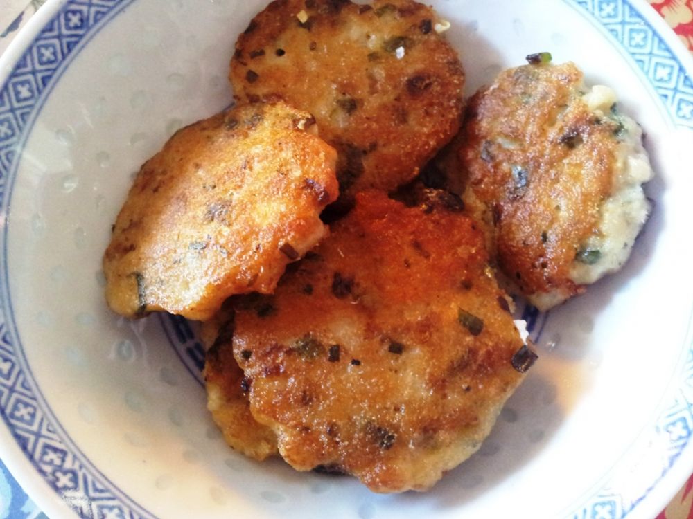 把所有原料拌匀,做成鱼饼状,shallow fry(应该是deep fry的,但为健康起见改成shallow fry),煎熟即可。
