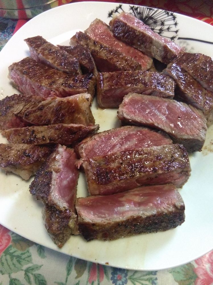 和牛排是在Costco买的, 是的澳洲也有Costco, 是澳洲出产的和牛。 平底锅放少许Butter煎两分钟, 同时撒上些盐和黑胡椒。 翻面再煎两分钟, 再撒些盐和黑胡椒。 离火, 盖上Aluminum, 五分钟。 切开享用, 切大块的。 一口下去, 油脂四溅, 鲜嫩无比。 有大块吃肉大杯喝酒的感觉。