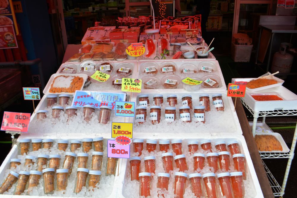 在市场的商店里还有一种腌的鱿鱼辫子的东西,像极了蟹糊的风味, 没蟹糊咸比蟹糊有咬劲。下面第二图的腌鱿鱼辫子带些辣味。买了几罐,后来用来拌沙拉,下酒过饭团都是极好。还有腌的明太子和海胆也是极好的, 做三明治相当惊艳。