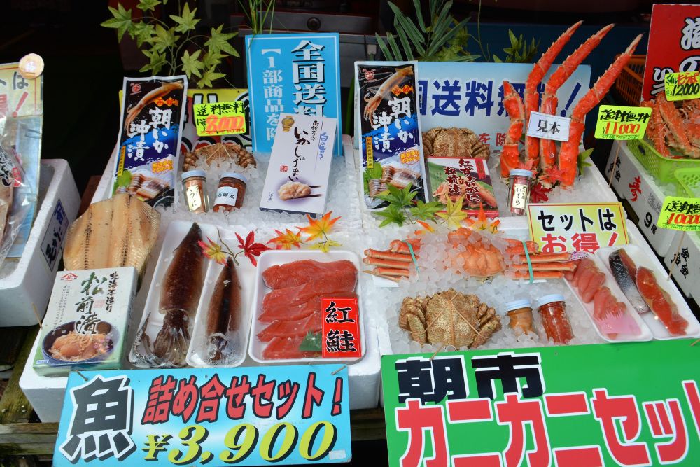 函馆朝市卖的东西很多, 但以鲜活海鲜和加工海鲜为主。鲜活的海鲜以蟹和贝类为主, 还有我以前没有见过的活鱿鱼。有个店还有钓活鱿鱼的游戏,从盆里钓上来直接吃沙西米。干货以鱼海带鱿鱼和干贝为主, 价廉物美,当地人和游客都会买。