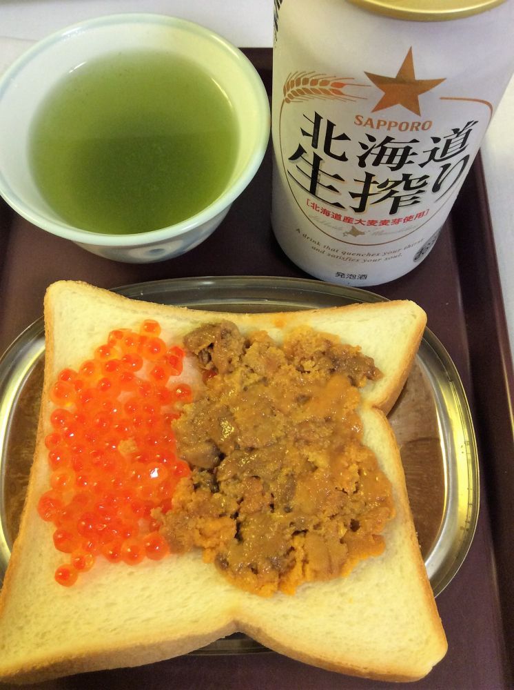 啄木亭洗心革面之后便来到函馆朝市的一个以鲜活海胆闻名的饭店吃饭,饭店的名字叫村上海胆饭店。店不大, 名气很响,是很牛的网红店。因为没有预约, 和经理通融一下, 最后经理同意给我们安排个桌子, 不过要在一小时内吃完。来不及点烤的炸的食物,我们就点了这里出名的海胆饭和鱼籽蟹肉饭。 六月真是海胆上市之时,鲜活的海胆肥腴而清爽, 略带点甜味, 真是无与伦比的美味。更难得的是所有的海胆都一般大小一般颜色, 不愧为吃海胆的名店。鱼籽也是相当不错的选择, 一口咬下, 鱼籽在口内爆裂, 鲜味随着淡淡的咸在嘴里慢慢扩散, 不失时机的啜口北海道啤酒......北海道的扎啤也是非常之好。