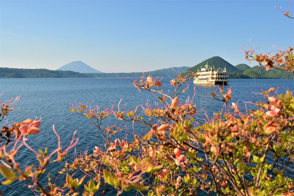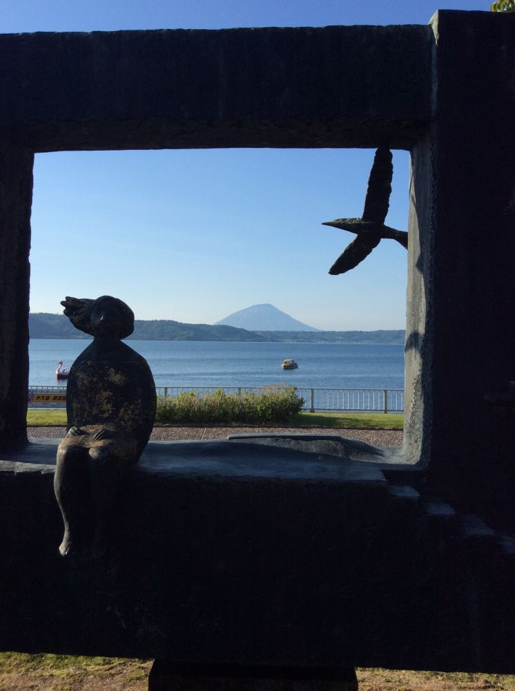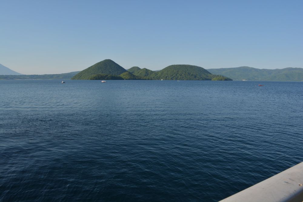 洞爷湖水质很好, 蔚蓝, 透明度很高, 鱼的资源也是非常丰富。背景远处的高山叫羊蹄山, 很有名气。由于其形态很像富士山,而被称为虾夷富士。南岸的街景也不错, 有许多温泉酒店。