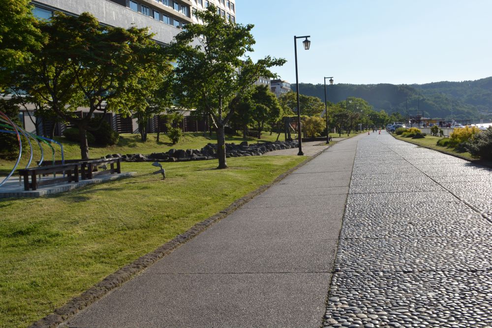 离开大沼公园后有相当长的一段时间在高速公路上, 比较寂寞。但当靠近内浦湾,沿岸的景色相当漂亮。停在路边随便拍几张也是够惊艳,青青的草, 碧蓝的海, 一望无际。