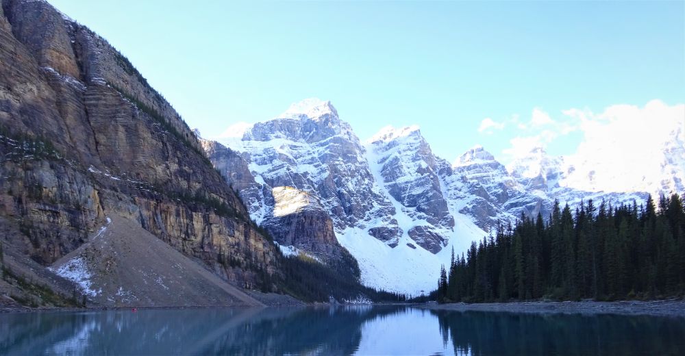 梦莲湖(Moraine Lake)是 加拿大 亚伯达省 班夫国家公园 的一个冰川湖。位于十峰山谷下,海拔高度为1,884米,湖泊面积为0.5平方公里。由于梦莲湖是一个冰川湖,因此只有到每年六月中旬至下旬,湖水才到达最高线,折射沉积的岩粉,呈现出美丽的蓝绿色。