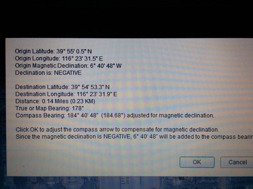 这里显示了这一位置的具体地理信息及磁偏角,点击 OK 会给出校正后的数据。