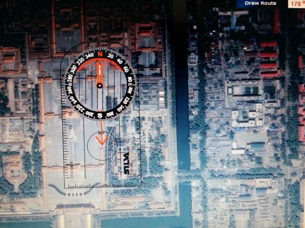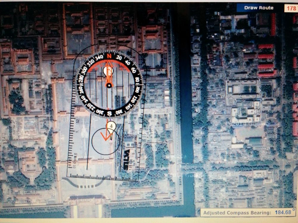 点击 OK 后,右下角显示的184.68度是校正了磁偏角后的数值, 也就是风水研究中所要使用的数据,如果用罗盘去现场测量,应该显示的就是该数值。也就是说紫禁城坐北朝南(子山午向),偏西4.68度。当然这里只是举例和示范,没有非常认真的去测量,数据只作参考。