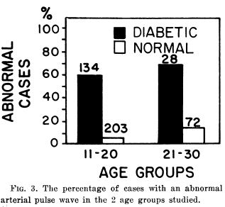 Ninety-nine (62 per cent) of the 162 diabetic subjects had abnormal arterial pulse waves, as shown by a diminution to disappearance of the dicrotic wave. In contrast, only 22 (8 per cent) of the 275 presumably healthy young people, also between the ages of 11 and 29 years, had abnormalities of their arterial pulse wave recordings.