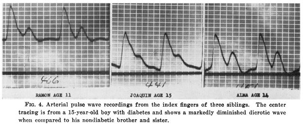 Whether the altered dicrotic wave found in young diabetic patients reflects some change in elasticity or whether it represents true organic change in the blood vessels of these people is undetermined. Whatever the cause, a method has been presented that seems to offer a means of detecting changes in the configuration of the arterial pulse wave of young diabetic patients, and in some nondiabetic subjects with a family history of the disease, that antedates clinical evidences of change in their vascular system.