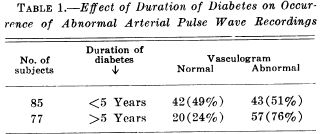 No correlation could be established between the severity of the diabetes, as measured by insulin requirements, and the presence of an abnormal arterial pulse tracing. The longer the duration of diabetes, however, the more likely was the pulse wave to be abnormal (table 1). About half of 85 subjects who had been diabetic less than 5 years had abnormal arterial pulse waves. Seventy-six per cent, however, were abnormal among 77 persons who had been diabetic longer than 5 years. None of these patients, it is important to emphasize, had any clinical evidence of vascular disease.