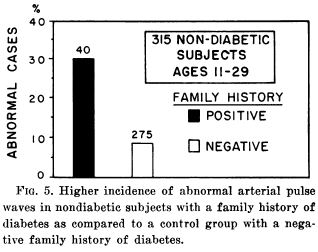 Further evidence that the vascular abnormalities are not a consequence of the disturbed carbohydrate metabolism is the fact that a high percentage of normal children with a positive family history of diabetes show alterations of their arterial pulse waves. Thirty per cent of the patients with a positive family history had abnormal dicrotic waves as compared to only 8 per cent abnormalities in the control group.