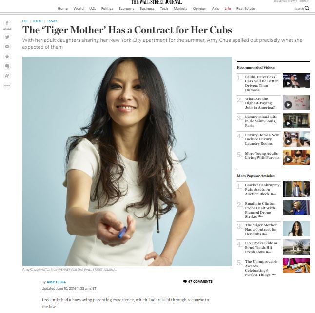 写《虎妈战歌》的蔡美儿在“华尔街日报”发表文章,讲述发生在她和女儿之间一段令她有些伤心的经历。