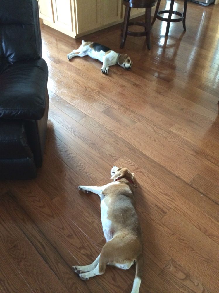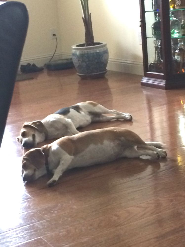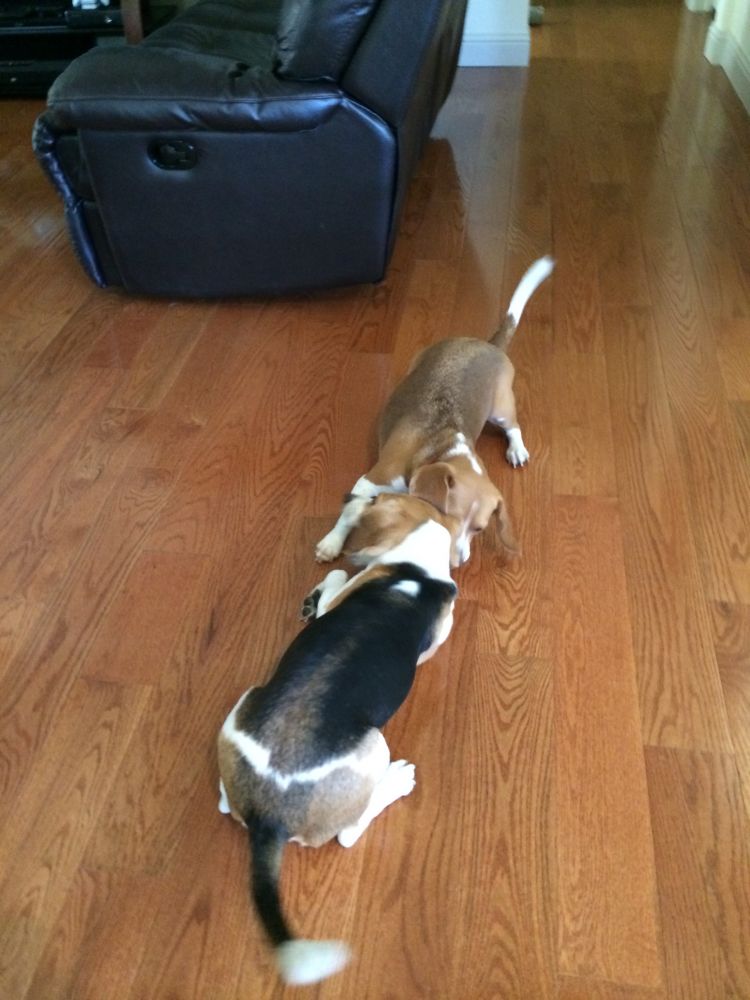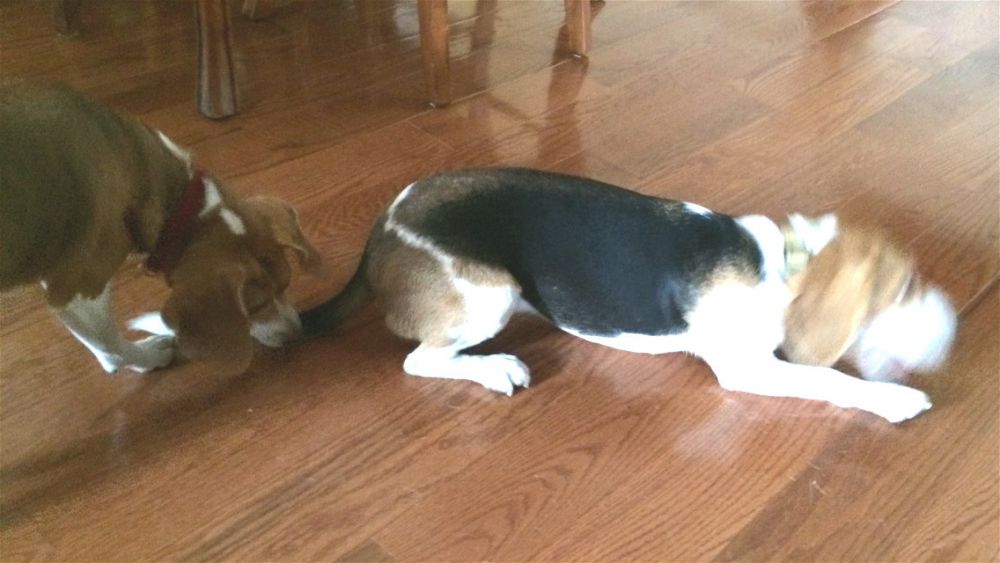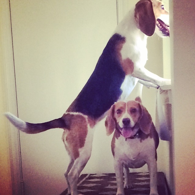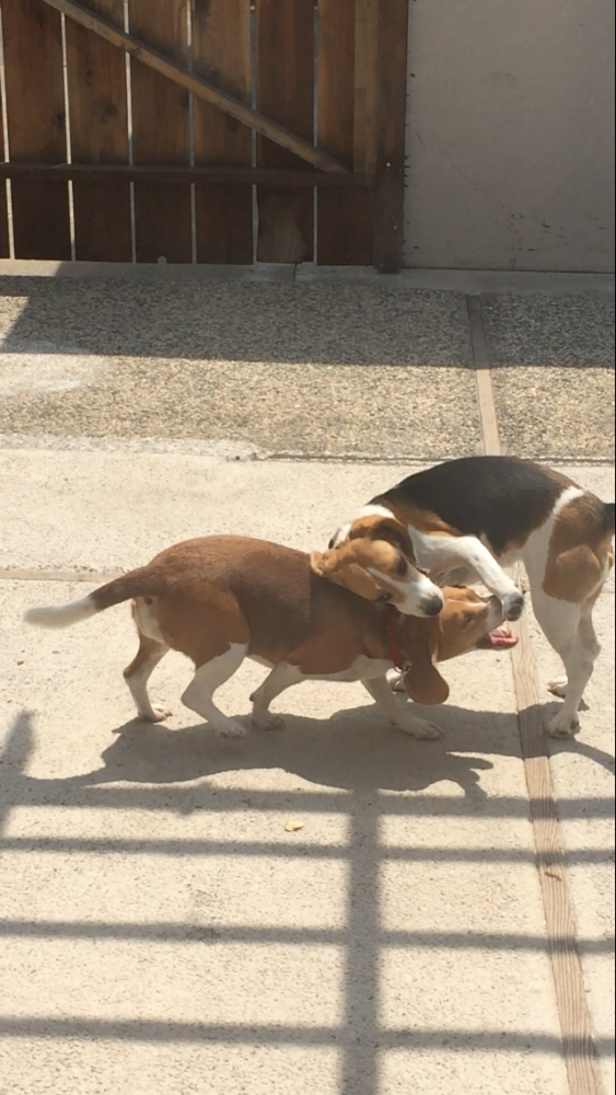 好友之一雅典娜也是比格犬,今年4岁。雅典娜的妈妈每次去健身,就把她丢我这儿。她一来,柠檬就疯狂了。