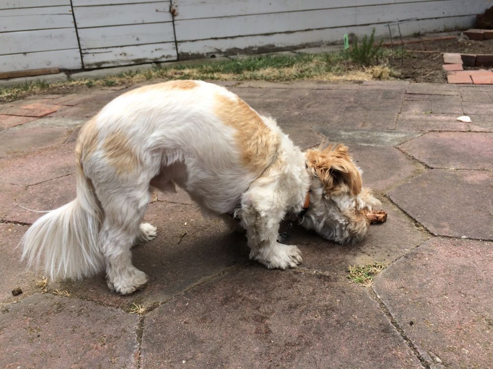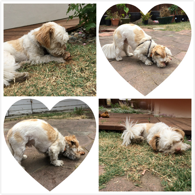 查理嘴巴小,牙齿更小,别人已经啃完回屋歇息了,他还在斗骨头,小可怜的,起码知道跑草地上抱着骨头慢慢玩了。。。
