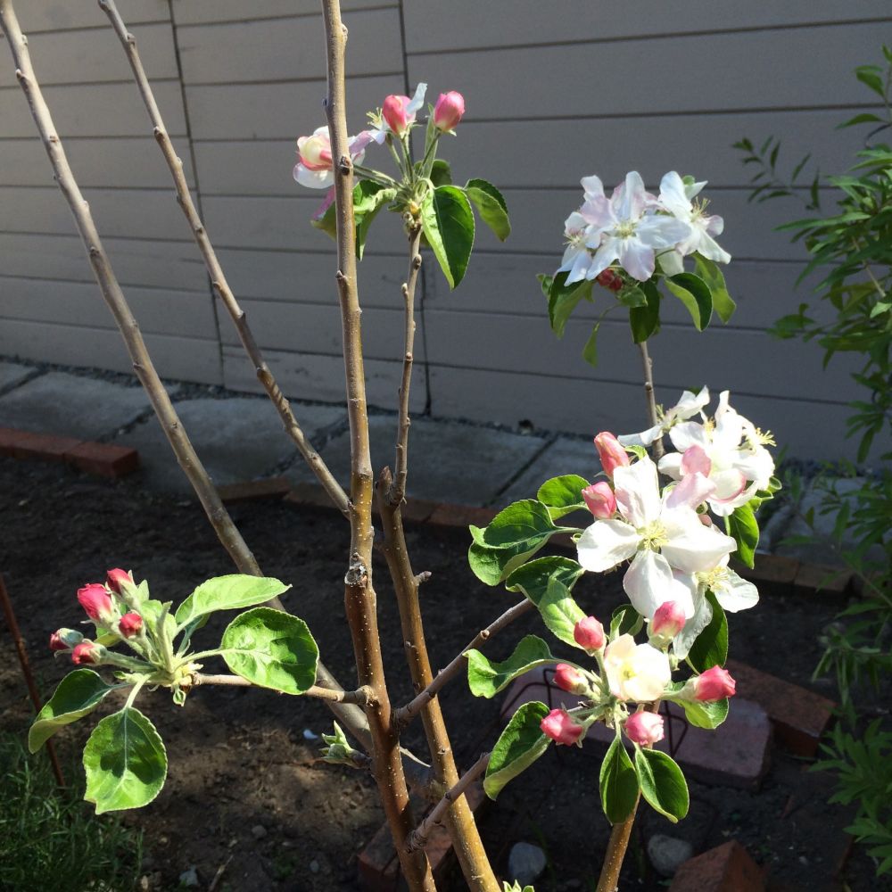 这个白桃,是在costco店里被人挑拣剩下的最后一棵,主干还折断了。我种树很菜鸟,只种过玫瑰,以为神马都可以像玫瑰一样随便剪了再长,再看了介绍是侏儒小树,正中下怀就抱到购物车里不肯放手。