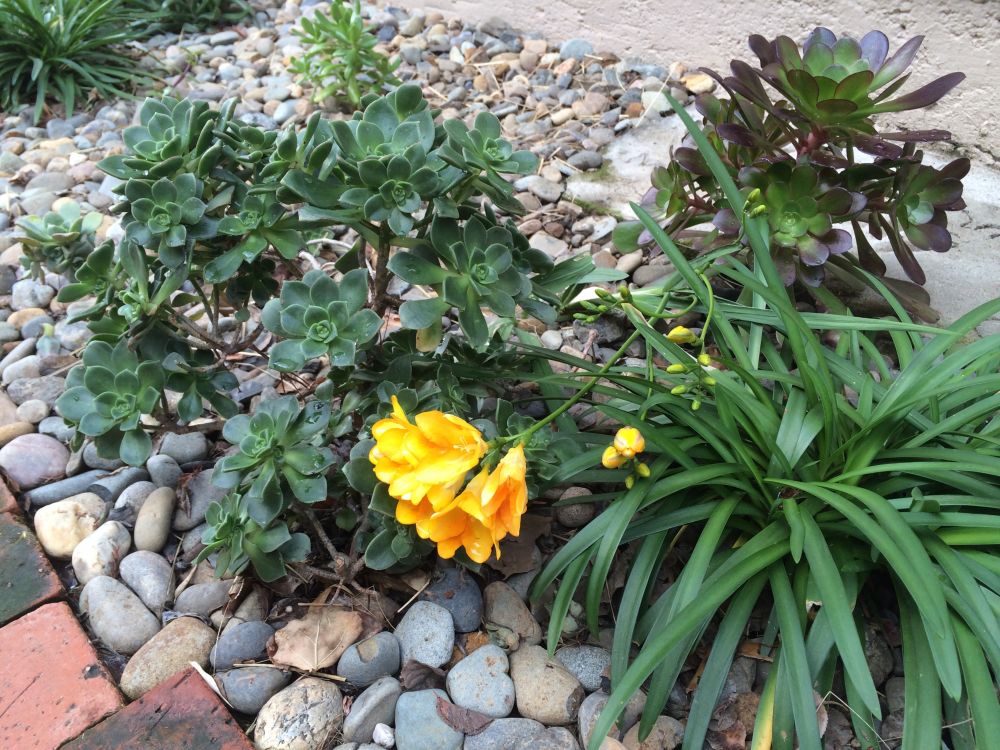 去年,又从几个朋友处搜集到七八种肉肉花,这次我直接给它们在户外安家,在靠近墙角的地方,与我喜欢的小石子为伴。安顿好了,我就忘了它们,即使干旱的夏秋两季,也是看到它们奄奄一息了,才想起要浇水,反正我已经有教训了,养不活是正常的。冬天来到,我们的雨季也来了,某天在院子里游荡,发现石子上面多了几簇绿色,肉肉花不但活下来了,还扩张了,从单枪匹马的一朵变成拖家带口的一群,一副快乐结实的样子。