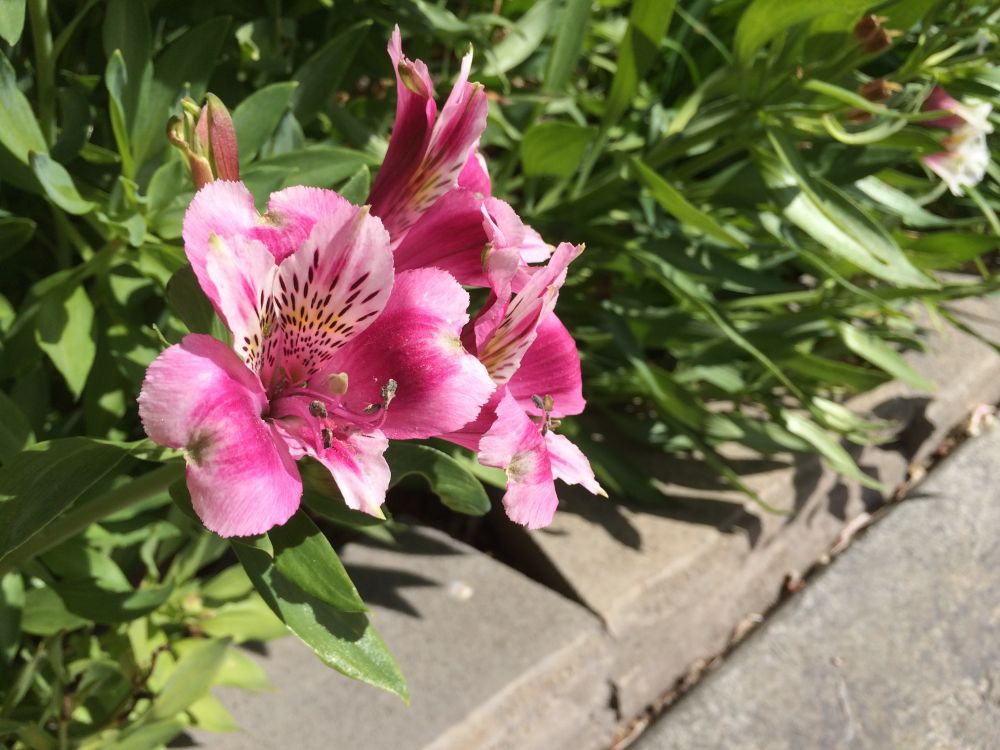 这两丛粉色和红紫色的秘鲁百合,在我们家的历史很长,超过15年,秘鲁百合喜欢凉爽天气,繁殖力强大,花开长久,花期始于深秋,来年仲夏才肯终止