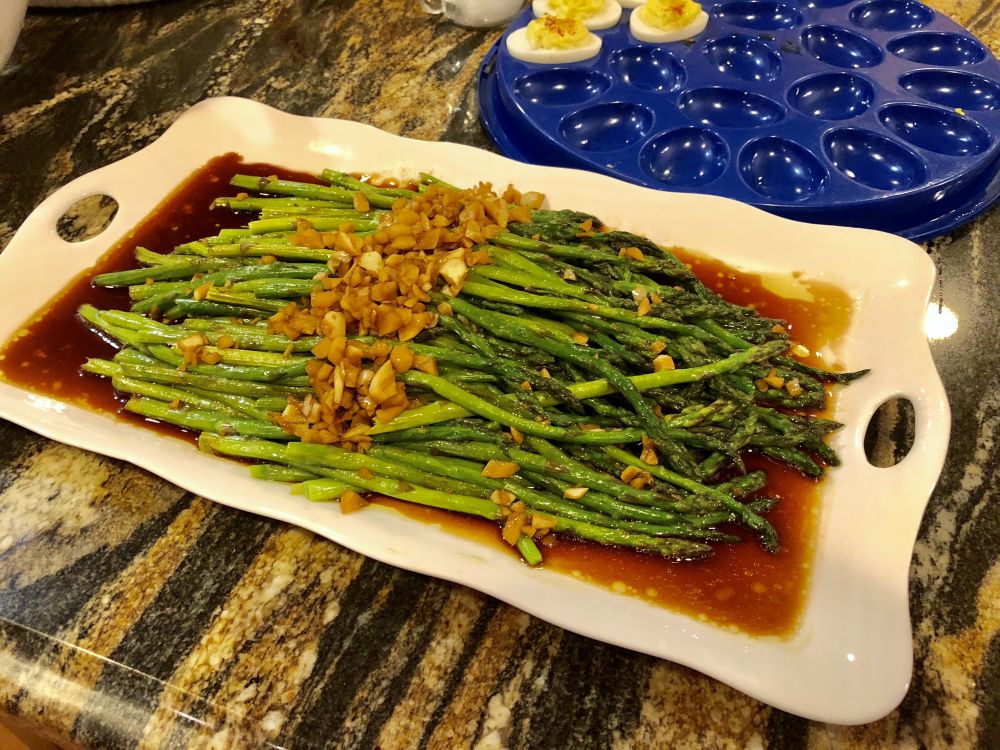 我被分配做青菜,计划了三个青菜,蒜香芦笋,松籽玉米和蘑菇小白菜,这帮人是吃肉大王,青菜只是陪衬,三个菜足够了。可是,我的如意计划流产了,原以为主厨们在后院烧烤,没想到他们要在我的厨房里煎牛排炒烩饭。5点开饭,现在已经是4点,我只好抢在他们前面做青菜,芦笋今天是必不可少的,我们专门去whole food 买的有机芦笋,必须趁新鲜吃掉。其他的菜就免了吧,来不及做了,因为我知道这帅哥美女大厨师一边做菜一边看手机菜谱,每次需要的时间都比他们计划的多一倍。